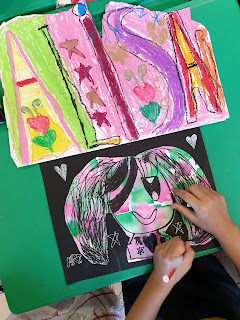 Phew! The children ended their term one task with a gallery walk (in circles). Many opportunities for making decisions are provided to allow them to build their confidence. For example, I will usually go through a set of instructions before their independent work and that requires active listening. So, in the event that they'd forgotten after I've given my instructions, they could ask a trainee teacher. The children made choices on their line drawings, selection of art supplies, their seating area or who they would like to sit with on that day. Classroom management includes scissors safety and their movement in the art room. These are seemingly simple tasks to an adult but they require a substantial amount of time to complete. Especially so when the students were writing their artist statements and needed spelling words.